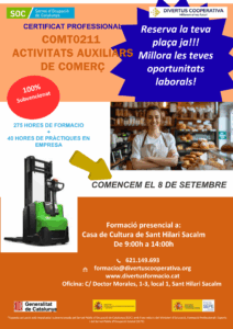 Amb la col·laboració de l’Ajuntament de Riells i Viabrea hem acordat homologar l’aula de formació per a poder realitzar el Certificat Professional d’Operacions auxiliars de serveis administratius i generals (CODI ADGG0408), que permetrà a l’alumnat obtenir un títol de formació reglada vàlida a tot l’Estat i que inclou pràctiques amb empreses del municipi. - CERTIFICAT PROFESSIONAL D’AUXILIAR DE COMERÇ – INICIEM EL 8 DE SETEMBRE !!!